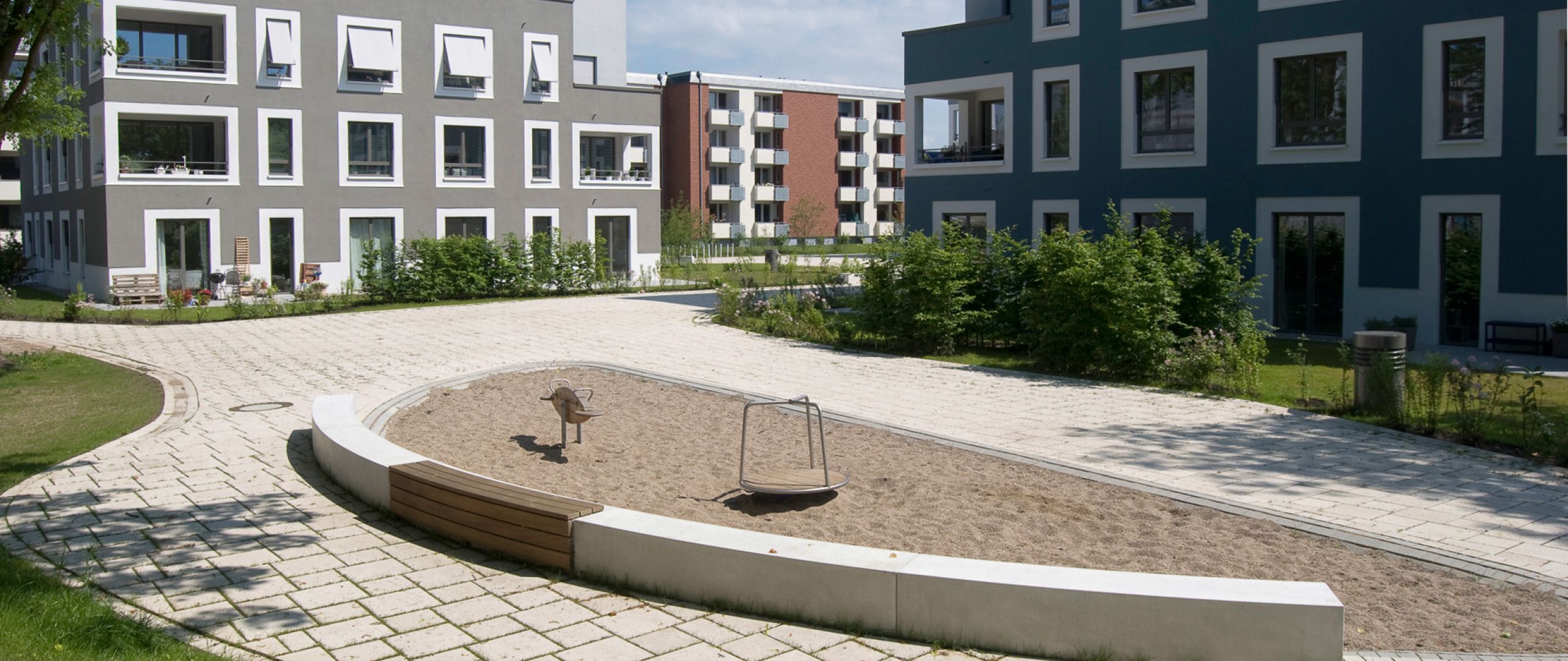 Das landschaftliche Konzept der fließenden Grünräume wird durch die freistehenden Gebäude gestärkt und der Blick wird immer wieder neu zwischen den Häusern ins Grüne gelenkt. Geschwungene Wege durchziehen die gesamte Anlage. Den Wegen angegliederte Aufenthaltsorte und Spielflächen fügen sich harmonisch in die Parklandschaft ein.