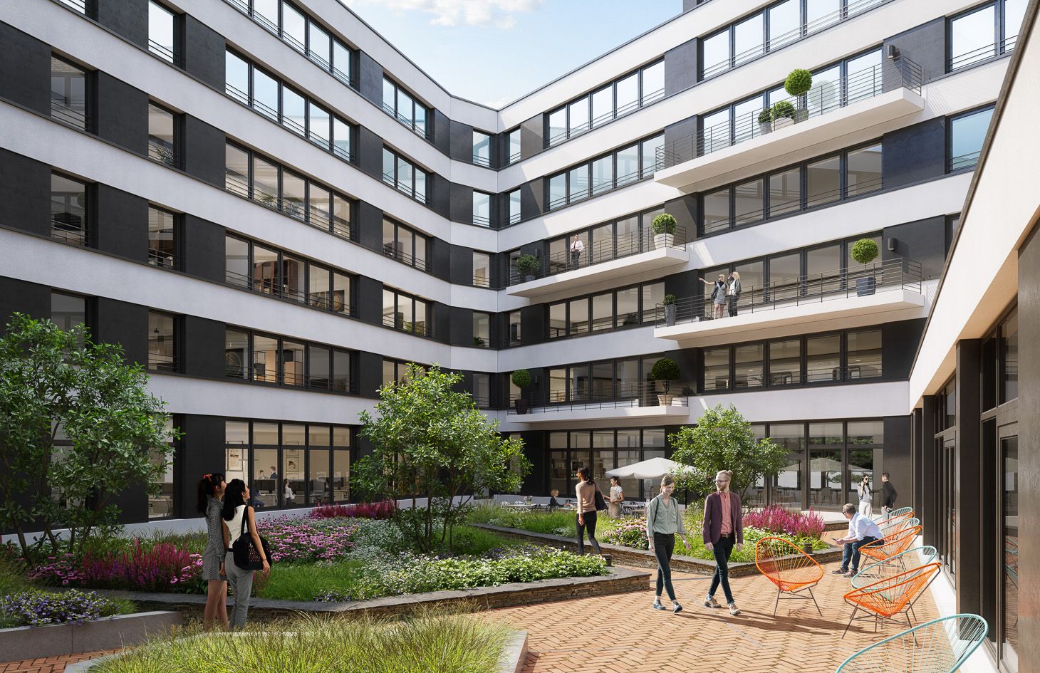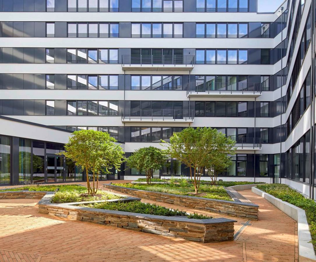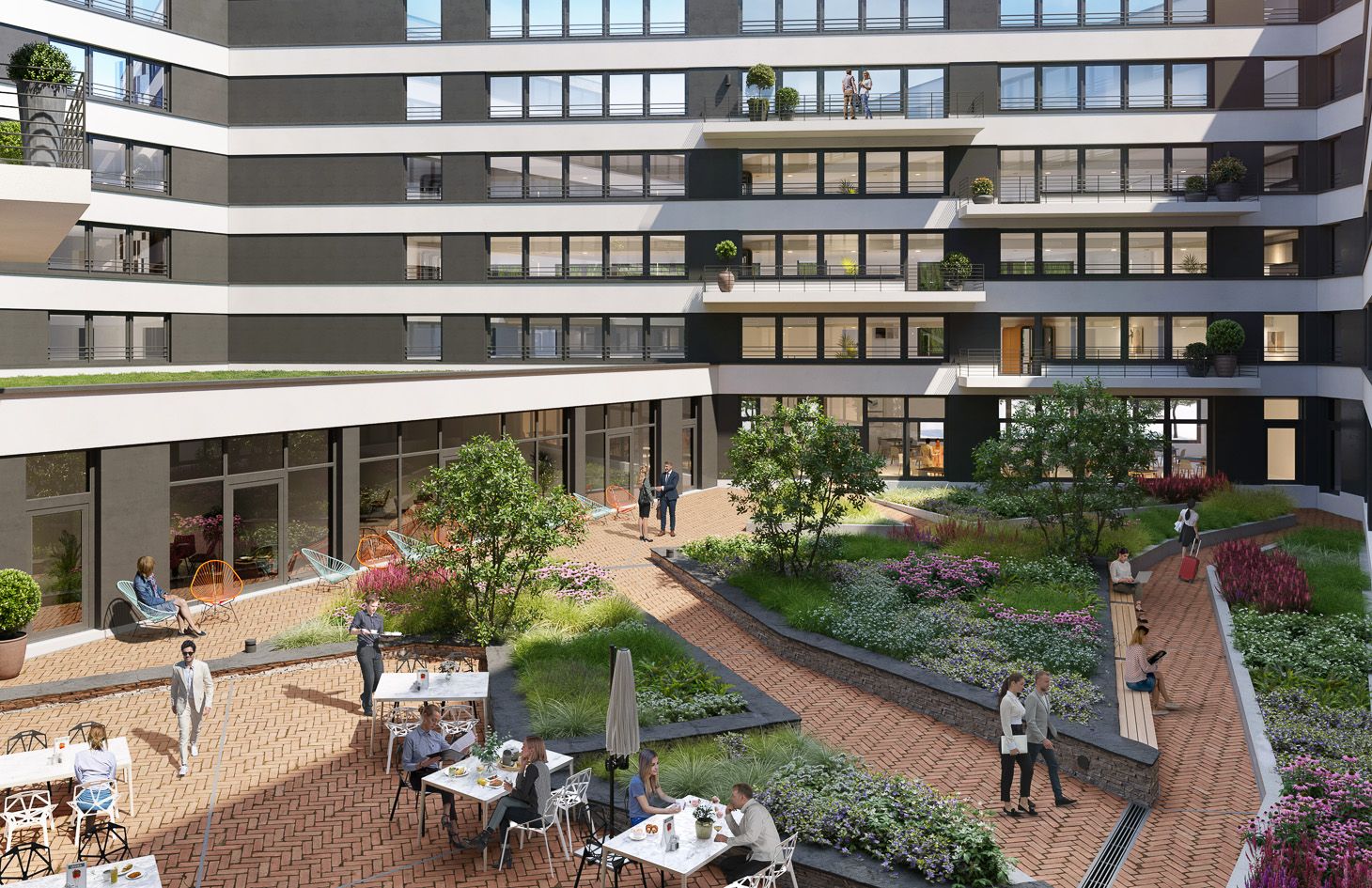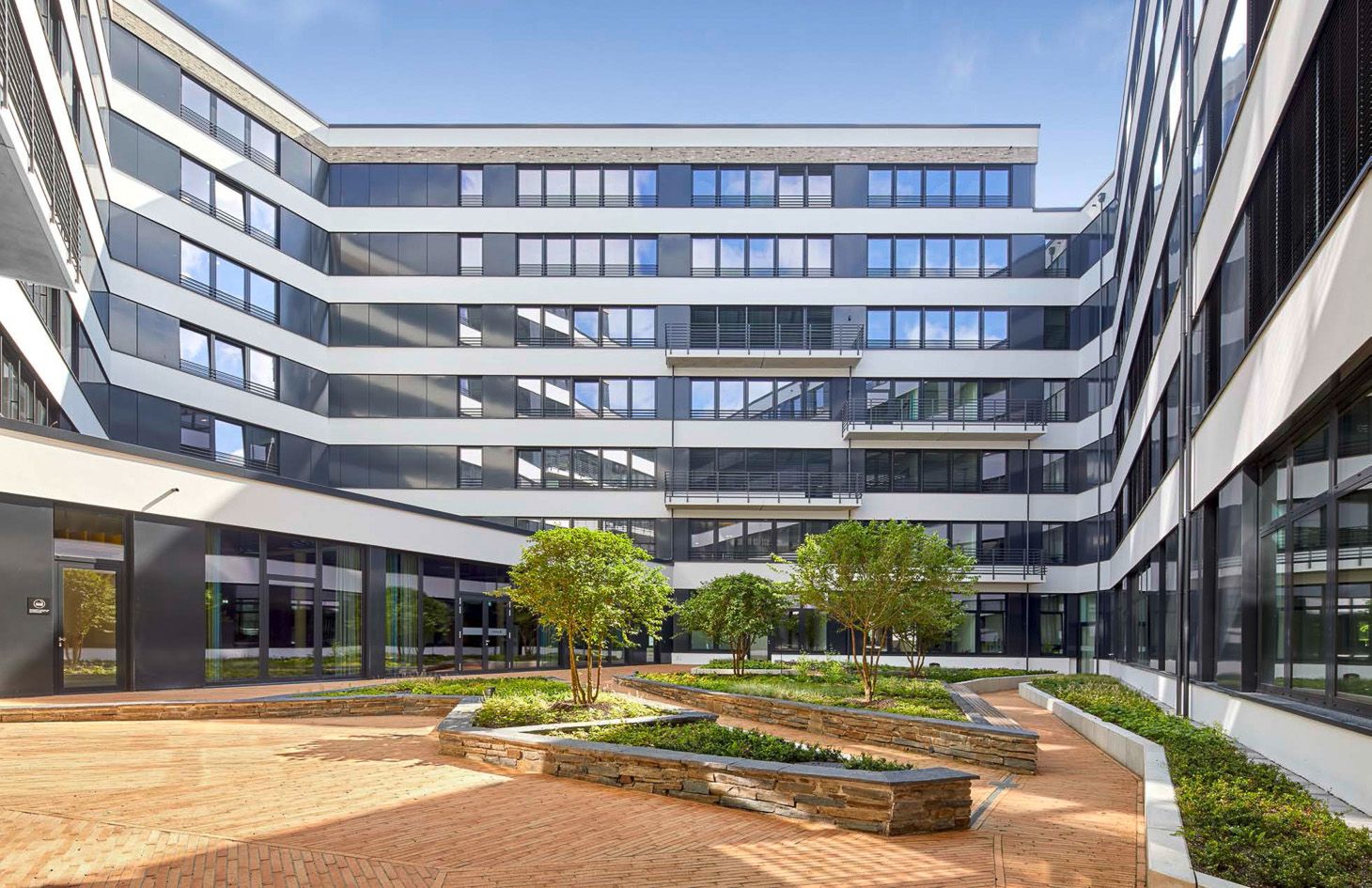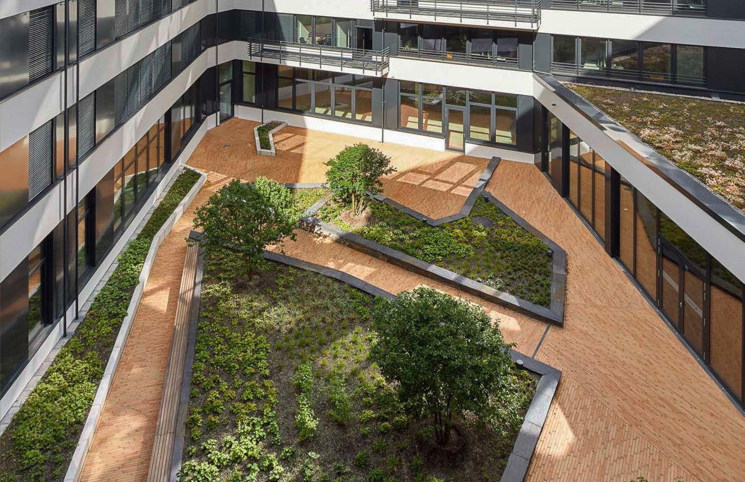 Der Freiraum verteilt sich auf einen innen liegenden Hof mit gebäude­bezogener Freiraum-Versorgung und einen dem öffentlichen Raum zugewandten Rahmen. Der begrünte Innenhof ist eine Oase der Ruhe und Entspannung, abgeschottet von außen ablaufenden hektischen Verkehrs­strömen. In einem Schollen­system sind sowohl Grün­flächen als auch befestigte Aufenthalts- und Verbindungs­flächen organisiert.
