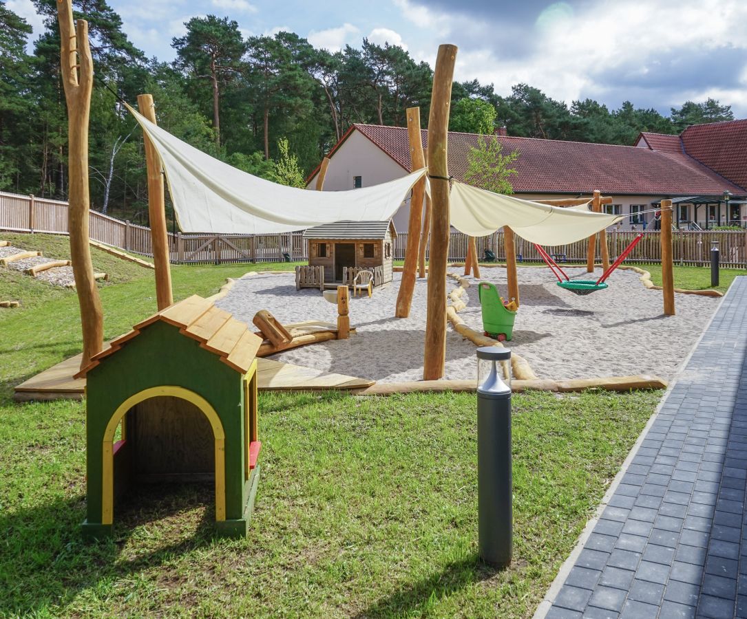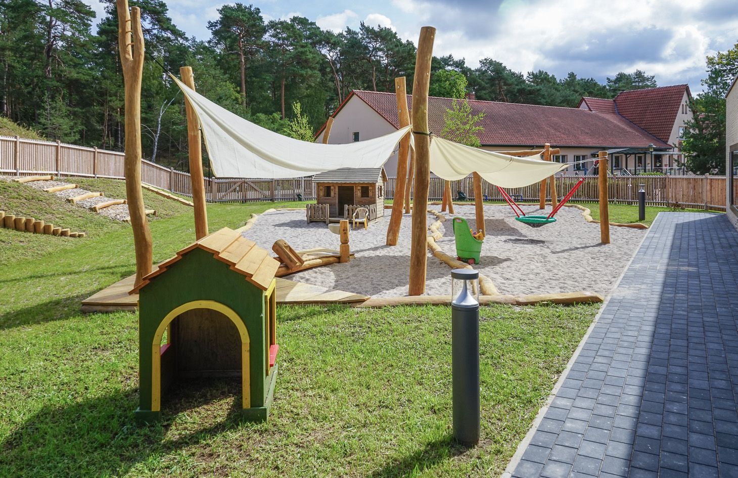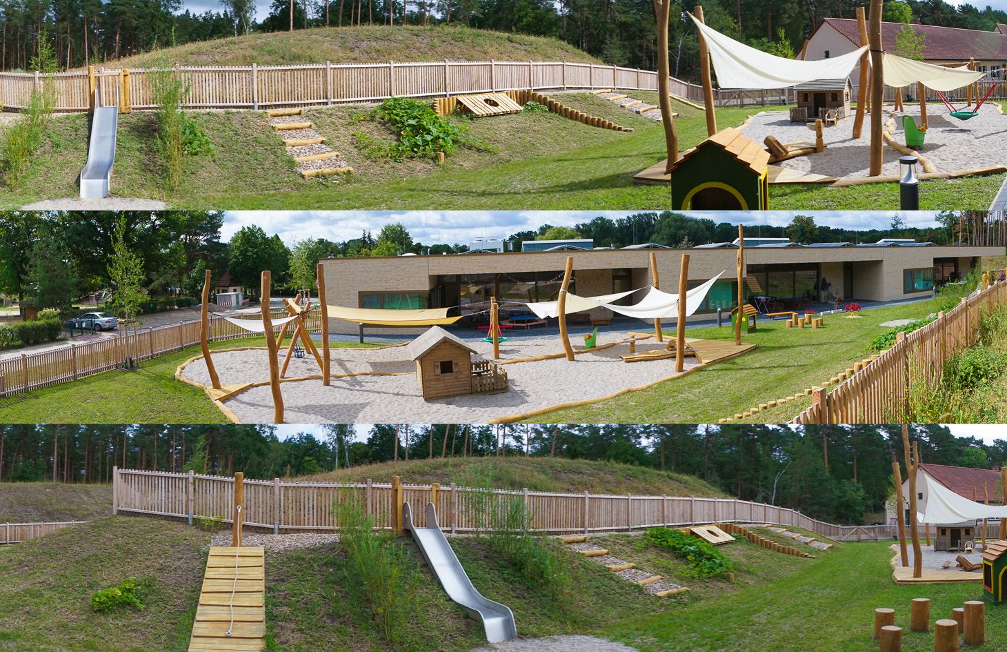 Ein Wegesystem aus Holzhäcksel führt aus dem holz­umzäunten Kita-Gelände zu den vegetationsfreien Sand-Hochplateaus und Landschafts­formationen, die mit Sand­trocken­rasen, Wald­saum und Wald­rand zum benachbarten Kiefern­wald überleiten. Der Robinien­holz-Spielplatz lehnt sich an die hügelige Hang­topographie.
